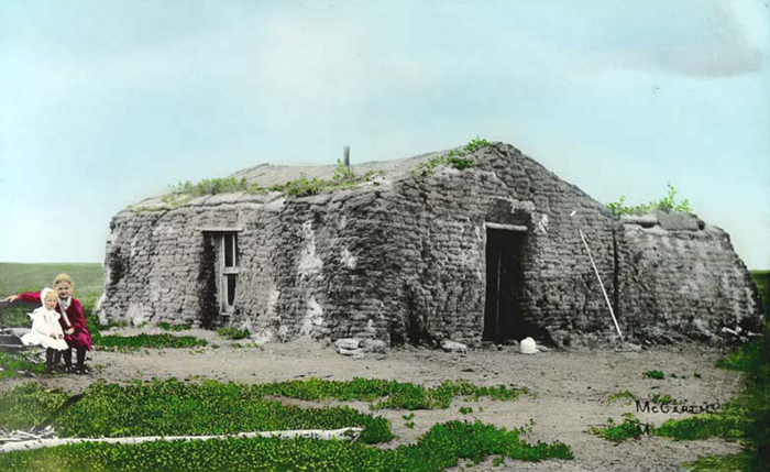 北達科達州的一間草屋 出處: McCarthy, John, photographer. "Sod house near Fairdale, North Dakota: two little prairie flowers." 1903? The Northern Great Plains, 1880-1920: Photographs from the Fred Hultstrand and F.A. Pazandak Photograph Collections, Library of Congress.
