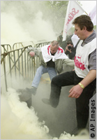工會成員,如照片中這些波蘭工會成員,認為自己的利益在後共產主義轉型時期受到損害。 |
