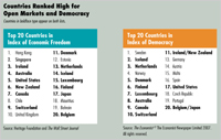 世界銀行增長與發展委員會(Commission on Growth and Development)最近公佈一份報告,對促使發展中國家經濟發展的各種因素作出分析。委員會中包括兩名諾貝爾獎獲得者在內的國際專家發現,其中一個關鍵因素是"具有公信力和包容性的、務實的政府"。該委員會發現的其他因素包括:一個國家在公共政策上展開辯論的質量、打擊腐敗的力度、機會平等──這一切都是通常認為與民主制度有聯繫的特徵。 此處的圖表證實了類似的觀點。把經濟自由度指數(Index of Economic Freedom)中的前20個國家與民主指數(Index of Democracy)中的前20個國家並列在一起,你看到的是什麼?有很多重疊。其中13個國家同時出現在兩個指數中。這樣看來,在自由市場和民主政府之間至少有某種聯繫。 《民主的好名聲》(Democracy's Good Name)一書作者邁克爾?曼德爾鮑姆(Michael Mandelbaum)更加明確地表述了這一聯繫。他在載於本期的文章中寫道:"政治民主的主要根源是自由市場經濟。雖然過去有、而且現在繼續有一些隻實行自由市場經濟而不實行民主政治的國家,但是21世紀實行政治民主的國家無一沒有自由市場經濟。" 但是,公共政策教授羅伯特?賴克(Robert Reich)去年在聲譽很高的《外交政策》雜誌中發表的一篇文章卻以"資本主義是如何扼殺民主的?"("How Capitalism Is Killing Democracy")為標題。 顯然,市場與民主之間不是直線的關係。自從1776年亞當?斯密(Adam Smith)的著作《國富論》(An Inquiry into the Causes and Nature of the Wealth of Nations)問世以來,馬克斯?韋伯(Max Weber)、約瑟夫?熊彼特(Joseph Schumpeter)和萊斯特?瑟羅(Lester Thurow)等著名經濟思想家一直就這一複雜的關係展開辯論。建立自由市場而不實行民主是否可能?自由市場和民主孰先孰後?普遍存在的發展經濟的強烈願望是否會導致非民主國家逐步實行民主? 為本期撰文的國際專家們對這些問題作出了一些回答。他們指出,創造財富的機會、社會信任以及"發言權"和問責制等都是相關變數。然而,我們的目標不是為一場長達幾個世紀的思想辯論劃上句號,而是幫助讀者對這個當今世界人人相關的問題加深理解。 ──編者