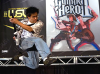 電動遊戲世界系列賽參加者在玩虛擬遊戲吉他英雄二。