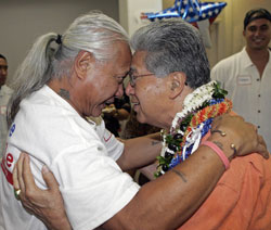 夏威夷的民主黨聯邦參議員李碩(Daniel K. Akaka,右)在檀香山競選總部向一位支持者致以傳統的問候。