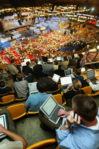 互聯網博客寫手在2004年波士頓民主黨全國代表大會上做最新報導。現代總統候選人提名大會更像一場喜慶的媒體盛筵,而不像嚴肅的政治活動。