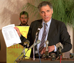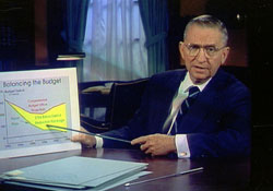 1992年,得克薩斯州的億萬富翁羅斯·佩羅(Ross Perot)由於對聯邦預算赤字感到擔憂而以改革黨候選人身份參加總統競選。圖為佩羅在電視上闡述其施政綱領。有人認為佩羅吸引了共和黨的部份選票,從而使克林頓(Bill Clinton)當選。