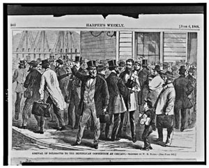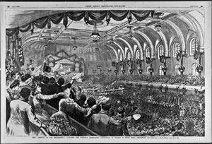 政黨總統候選人提名大會是一項歷史悠久的美國政治傳統。上圖:1868年在芝加哥參加共和黨大會的代表。下圖:1880年在辛辛那提舉行的民主黨全國代表大會。