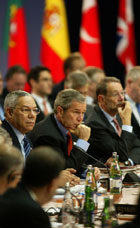 ![]() 喬治.布什總統(中)、科林.鮑威爾國務 卿(左)和歐盟外交政策進階代表哈維爾.索拉納2002年11月21日在北約首腦會議開幕式上。 (美聯社照片/Laurent Rebours) |